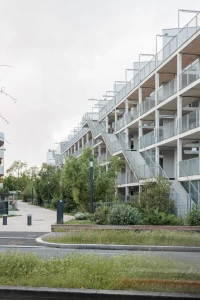 Reposant sur une forte rationalité, le plan offre 100 % de logements traversants et des duplex au rez-de-chaussée reconstituent l’échelle de maisonnettes autonomes.
