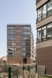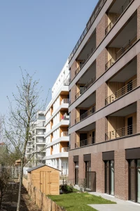 Ce projet de 77 logements au sein du quartier des Pantinoises prend la forme de 2 plots pentagonaux. Cette géométrie permet d’offrir 100 % de logements avec salons d’angle, un à chaque pointe du pentagone. Double exposées, ces pièces sont largement vitrées à la façon d’ateliers d’artistes. Le béton est ici limité à la structure primaire ( poteaux, dalles, bandeaux) alors que les façades sont composées de maxibrique brune posée en maçonnerie classique et autoporteuse.